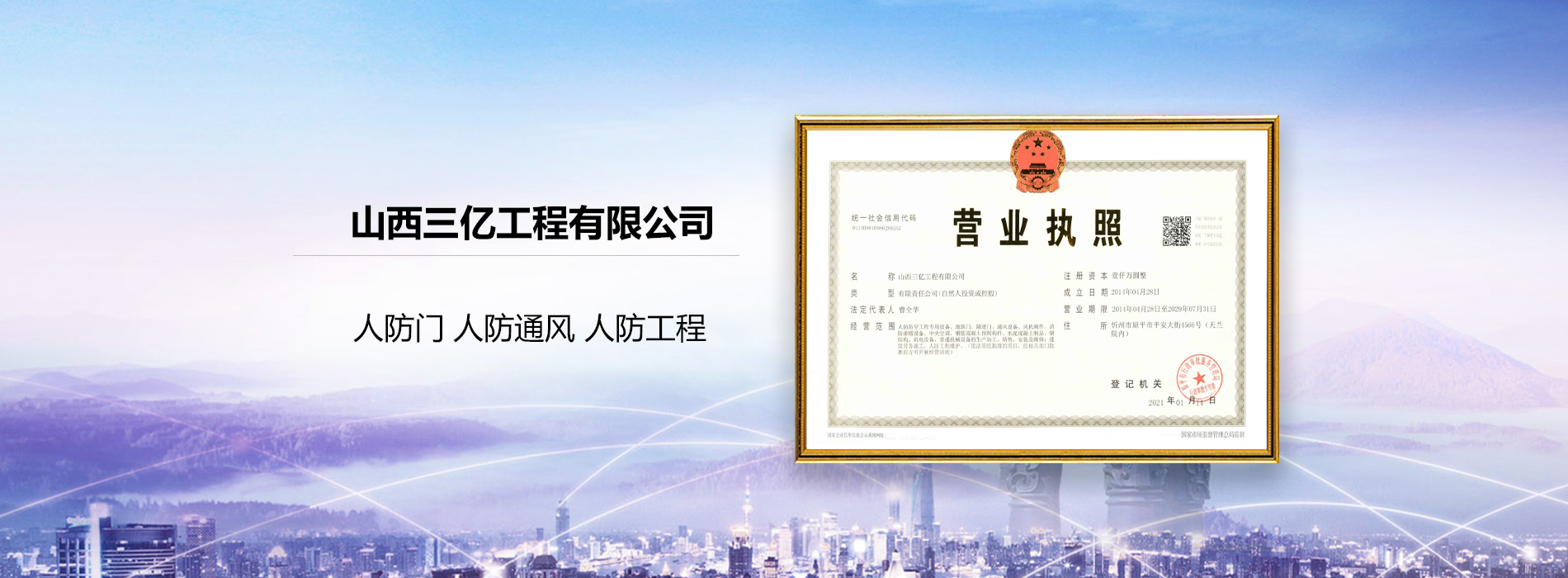 山西三億工程有限公司是經(jīng)人民防空辦公室批準(zhǔn)的人防工程的生產(chǎn)和定點安裝企業(yè)。公司及研發(fā).制造.銷售.服務(wù)于一體,產(chǎn)品通過 ISO9001 質(zhì)量認(rèn)證,并列入《人民防空設(shè)備產(chǎn)品目錄》。